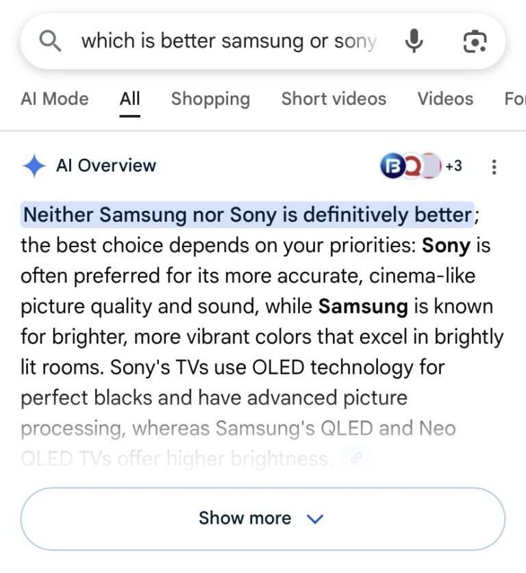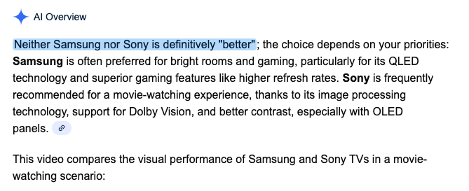 If you ask an AI like Google’s AI Overview or ChatGPT on your desktop, “Samsung vs Sony, which is better?” and then ask that exact same question on your phone, you’ll likely get two different answers. One version says neither is better, and another suggesting Samsung is better? Ask again tomorrow, you’re likely to get something different yet again.